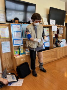 6/26木曜日午前中に第3回院内勉強会を開催しました。恒例のKスタジオ袖岡氏のストレッチ、有酸素運動後、部署別ミーティング、全体ミーティングを行い、くじ引きで4−5人グループでテーマ「木曜日休みの過ごし方」を私も入ってフリートークを行いました。皆それぞれ盛り上がっており、スタッフの考えなども聞けて参考になりました。その後帯状疱疹組み換えワクチンについての勉強会、私の講義(頸椎疾患について)の後、久光製薬さんに高齢者疑似体験を実際体験させていただきました。