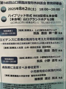 8/2山口臨床整形外科医会がありました。前田病院の前田浩行院長の「エビデンスに患者の気持ちを考えた骨粗鬆症治療〜骨形成促進薬の自己注射で患者さんの喜ぶ姿を見るために〜の座長をしました。骨粗鬆症治療で患者満足度を高める工夫として患者背景を考え、医師が主体的に治療してリエゾンより医師の説明も重要とのことでした。オスタバロなど骨形成促進剤の自己注射を簡単に諦めないで継続するための工夫を含めて教えて頂きました。骨粗鬆症を疑って骨密度検査を行うことが診断のコツであり、薬物治療を受けていない患者への導入とアドリアランス向上のために病院の待合室で患者向けの勉強会を開催されているとのことでした。骨折した患者さんが骨粗鬆症治療を持続率が低い原因として生命に関わるか?の認識が低いことがあり家族にも説明して病識を持ってもらうこと、骨粗鬆症治療と骨折予防を強調されました。骨吸収抑制剤による治療はリフォームで骨形成促進剤は新築のイメージで説明すると患者さんにわかりやすいとのことでした。骨折歴がある患者にはアナボリックファーストで骨形成促進剤を勧めますが認知症があり家族がそばにいないと難しいとのことでした。テリパラチドの手帳をスケジュール帳がわりにすること、日記のように書いてもらうなど工夫を教えて頂きました。