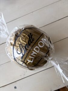 透明のプラスチックボールに歳の数だけリンドール チョコを詰め、それにゴールドの薄紙を巻いて、セロファンで飴のように包んでみました。リンドールのマークは拡大コピーしてセロファンに転写。