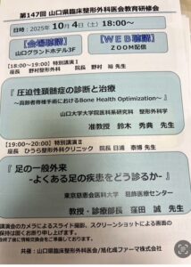 10/4山口グランドホテルで山口県臨床整形外科医会教育研修会がありました。講師は山口大学整形外科鈴木准教授の「圧迫性頚髄症の診断と治療〜高齢者脊椎手術におけるBone Health Optimization〜を拝聴しました。頚椎後方手術のラミノプラスティとは頚椎の椎弓を切除する椎弓切除術を改良して椎弓を残して拡大する椎弓形成術のことで1970年代から主流になりました。山口大学整形外科の服部名誉教授の服部式のビデオも紹介されました。その後椎弓形成術の術後不安定性、後弯変形、C5麻痺などの合併症に対する工夫、最近行なっている選択的椎弓形成術、頚椎後方手術に関する脊椎アライメントの矯正手術を紹介して頂きました。