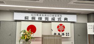 3/20 済生会山口総合病院新病棟完成式典があり山口市医師会長として参加しました。支部会長でもある村岡県知事のご挨拶の後、済生会理事長、山口市長などのご挨拶の後、郷良院長から新病棟の概要説明がありその後病棟案内がありました。集中治療室、手術室なども見せて頂きその広さと最新の設備に感嘆しました。当院からも多数の患者さんを紹介、救急でもお世話になっていますので今後の発展をお祈り申し上げます。