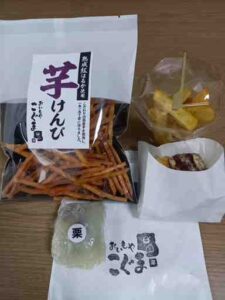 お店は家族経営をされているとの事で、お店に入ったときには、お店の続きにある調理場でご主人が作業されている姿が見えました。午前10時過ぎに入店したので焼き芋はまだ、出来あがっていなかったのですが、その他のスイーツは、いろいろと並んでいました。その中から「いも天」、「芋けんぴ」、「かりかり大学いも」、「ひやし芋」、「いきなり団子」、「芋チップス」を購入して帰り、家でゆっくりとスイーツを楽しみました。その中で「かりかり大学いも」が特に美味しかったです。