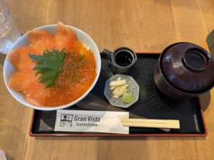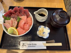メニューには肉系とか、瓦そばとかありましたが、周りが海なのでマグロづくし丼みたいなのを頼みました(* ‘ᵕ’ )☆