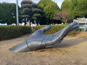 こんにちは看護師、診療放射線技師です。宇部市では「まちじゅうエヴァンゲリオン第5弾」が2025年11月20日から2026年3月15日まで開催され、いろいろな催しが実施されています。まちじゅうエヴァンゲリオン第3弾では常盤公園に「ロギンスの槍」が設置されましたが、第5弾では、宇部新川駅前に「エヴァンゲリオン」トリビュート彫刻として「エヴァンゲリオン初号機の手」が設置されました。写真を撮影するときに、彫刻の手に無数の足跡がついているのが見られましたので、手の上に乗って記念写真を撮影する方が多くいらっしゃると感じました。